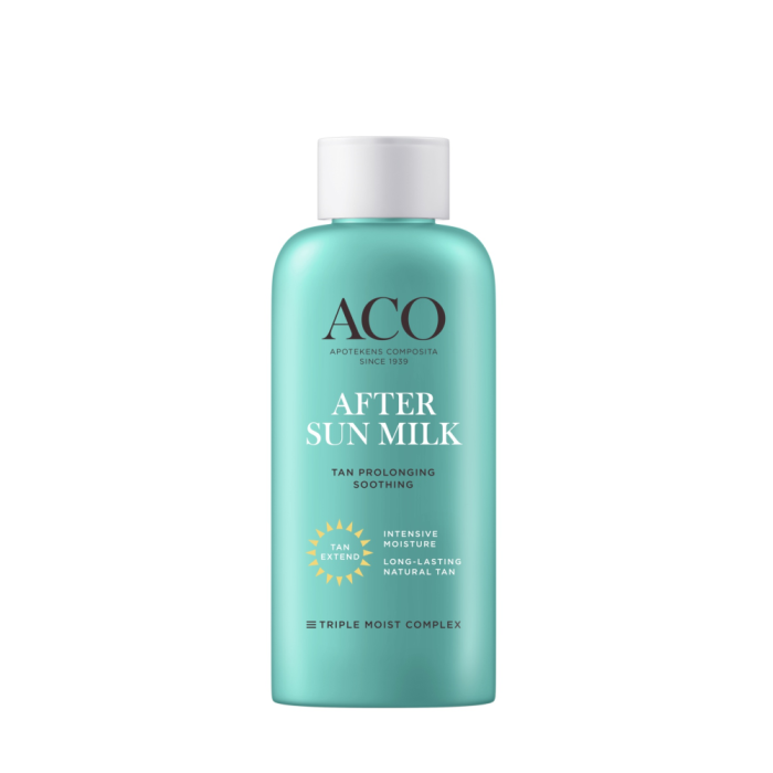 Rauhoittava ja tehokkaasti kosteuttava aftersun emulsio, sopii myös herkälle iholle. ACO Sun After Sun Milk Tan Prolonging on helposti levittyvä ja nopeasti imeytyvä emulsio, joka jättää ihosi silkkisen sileäksi eikä tahmaa. Sisältää Total Tanning System -ainesosayhdisteen, joka edistää ruskettumista ja pidentää luonnollisen rusketuksen kestoa sekä ACO:n Triple Moist Complex-kosteudensitojayhdisteen, joka kosteuttaa ihoa tehokkaasti ja pitkävaikutteisesti. Lisäksi voiteen canola-öljy pehmentää ja rauhoittaa ihoa ja E-vitamiini toimii antioksidanttina. Raikas ja miellyttävä tuoksu.