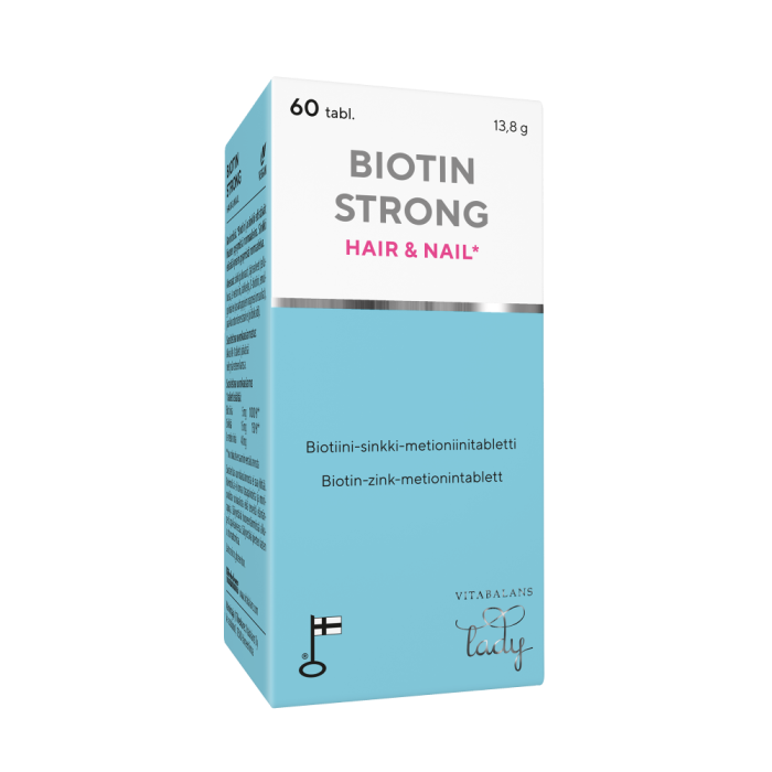Biotin Strong Hair&Nail on elinvoimaa hiuksille ja kynsille antava vahva biotiinivalmiste, joka sisältää biotiinin lisäksi myös sinkkiä ja metioniinia. Biotiini on tärkeä vitamiini hiusten kasvulle ja uusiutumiselle. Hiusten ja kynsien rakennusaineena toimii rikkiä sisältävä säikeinen proteiini, keratiini, ja valmisteen koostumusta täydentää rikkiä sisältävä metioniini-aminohappo. Hiusten ja kynsien hyvinvointia tukeva sinkki huolehtii hiusten ja kynsien normaalin kunnon ylläpidosta.