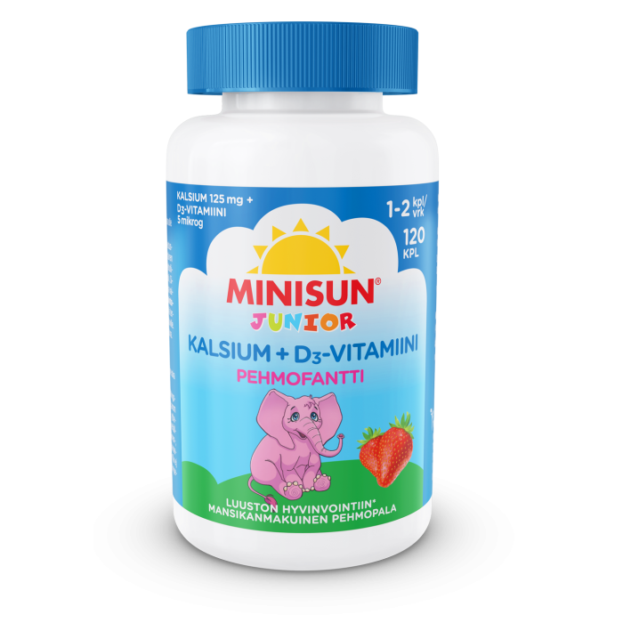 Minisun Luusto Pehmofantti Junior on hyvän makuinen pehmeä ja pureskeltava lasten kalsium- ja D3-vitamiinivalmiste päivittäiseen käyttöön. Kalsium ja D-vitamiini ovat tarpeellisia lasten normaalille kasvulle ja luiden kehittymiselle. Lisäksi D-vitamiini edistää kalsiumin normaalia imeytymistä. Mansikan makuinen ja norsunmuotoinen tuote on makeutettu hammasystävällisellä maltitolilla ja sen värit sekä aromit ovat luontaisia. Tuote sopii kalsiumin ja D-vitamiinin päivittäisen saannin tukemiseen erityisesti yli 3-vuotiaille lapsille ja nuorille. Minisun Pehmofantti sopii varsinkin lapsille ja nuorille, jotka eivät käytä maitotuotteita. Hyytelöimisaineena on liivate (naudasta). Maidoton, laktoositon, soijaton, hiivaton ja sokeriton. Ei sisällä gluteenipitoisen viljan ainesosia.