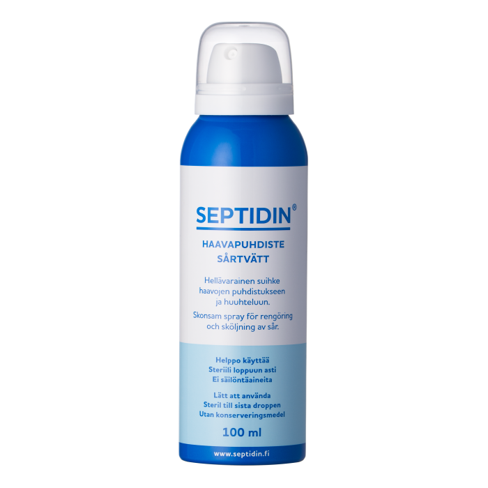 Septidin haavapuhdisteen isotoninen suolaliuos (0,9% NaCl) puhdistaa ja huuhtelee haavat hellävaraisesti ja tehokkaasti, edistäen näin haavan paranemista. Suihkepullo toimii kaikissa asennoissa ja neste pysyy steriilinä loppuun asti.