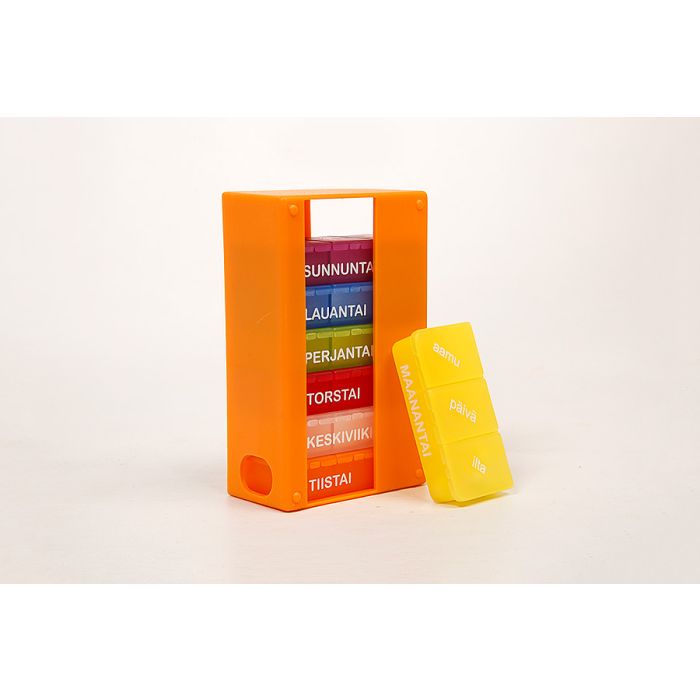 Jokaiselle viikonpäivälle värikäs ja tilava lokerikko, mikä on helppo ottaa mukaan. (aamu- päivä, ilta ja yölokero)